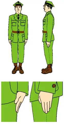 Żołnierz w postawie zasadniczej bez broni; u dołu dokładniej pokazane ułożenie jego dłoni