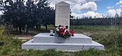 Tu walczyli chłopi i robotnicy z oddziałów partyzanckich AL i BCh którzy wspólnie z Armią Radziecką gromili faszyzm hitlerowski. Sława Armii Radzieckiej i partyzantom AL i BCh. Ten kamień położyli rewolucyjni chłopi i robotnicy. Mokre 13 maja 1951 roku.