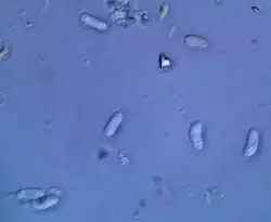 Zarodniki cylindryczne, nieco zgięte, gładkie, szkliste, 7-8 x3-3,5. Lamprocystydy o grubych ścianach, tępe lub spiczaste. Strzępki grubościenne, słabo podzielone, ze sprzążkami[4].