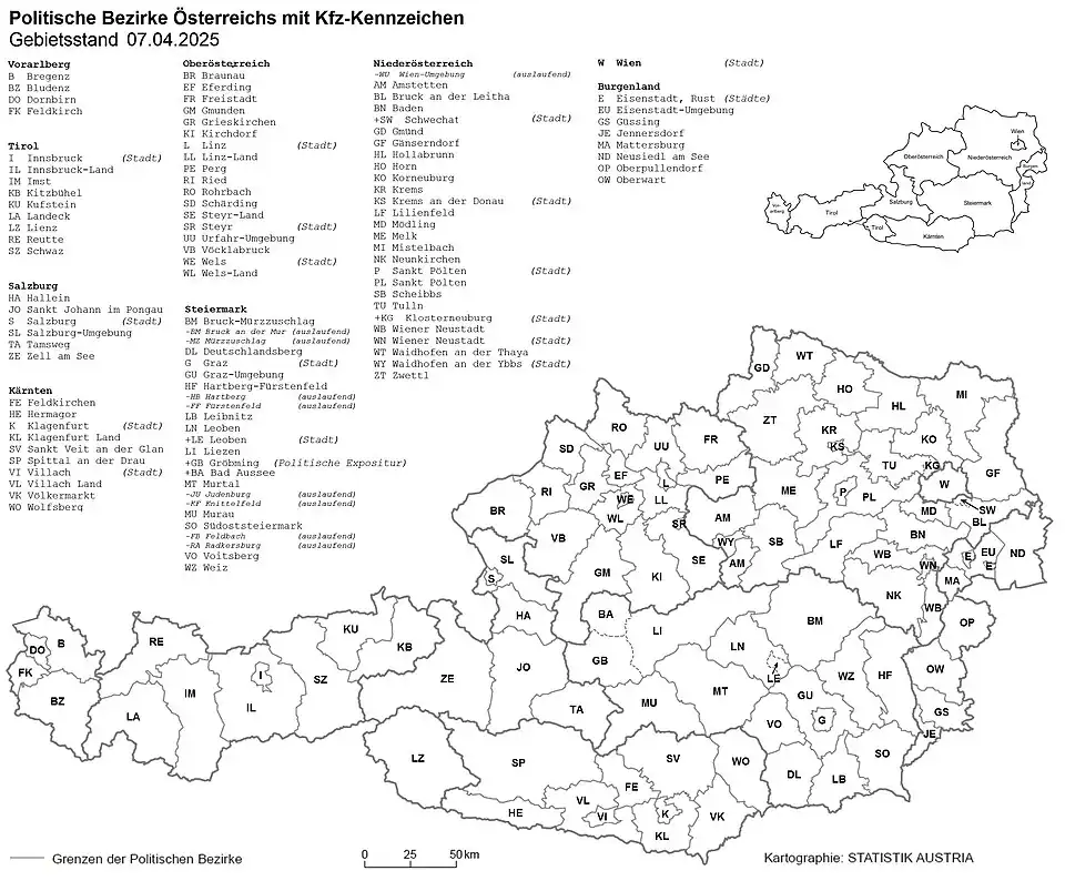 - ↑ Kfz-Kennzeichen in Österreich nach Bundesländern. autokiste.de. [dostęp 2023-11-24]. (niem.).