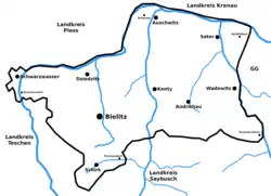 Już 3 września wojska niemieckie zajęły Bielsko. 8 września Adolf Hitler zakomunikował chęć włączenia podbitych terenów z Bielskiem i sąsiednią Białą Krakowską do III Rzeszy. Kwestia ustalenia nowej granicy i administracyjnej przynależności regionu pozostawała jednak przez cały wrzesień w zasadzie otwarta. Ostateczna decyzja o włączeniu powiatów Cieszyn-Frysztat i Bielsko-Biała pod zarząd w Katowicach zapadła 6 października[1]. Połączone zostały powiaty bielski i bialski oraz część wadowickiego w jeden powiat ziemski (Landkreis) sięgający od Wisły i Strumienia po Skawę z Zatorem i Wadowicami, jak też leżącymi za Skawą Miejscem, Spytkowicacmi, Bachowicami i Woźnikami. Przesunięcie granicy do Skawy było echem pojawiających się już wcześniej żądań miejscowych środowisk niemieckich o włączenie do Śląska zachodnich terenów Galicji, przede wszystkim z pozostałymi gminami bielskiej wyspy językowej. Ostatnim razem takie starania miały miejsce w latach 1915 do 1917, kiedy zażądano przyłączenia terenów najpierw do Soły, później również powiaty oświęcimski i żywiecki[3]. Nasiliły się one po wydaniu aktu 5 listopada 1916, kiedy pojawiła się groźba odłączenia Galicji od Austrii i na początku 1917 po wydaniu książki Gerharda Seeligera pt. Das Deutschtum in den Westbeskiden und die Herzogtumer Auschwitz und Zator, która starała się udowodnić tezę, że tereny te rzekomo zachowały niemiecki charakter pomimo przynależności do Polski w wiekach XVI do XVIII[4]. Tęzę tę umocnił Kurt Lück w latach 30. XX wieku.