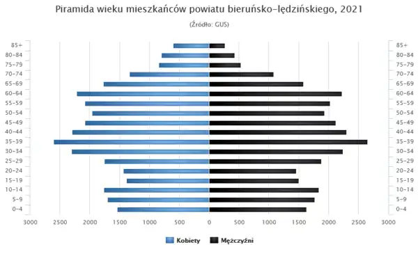 Piramida wieku mieszkańców powiatu bieruńsko-lędzińskiego w 2021 roku[4]: