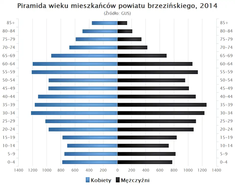 - Piramida wieku mieszkańców powiatu brzezińskiego w 2014 roku[10].
