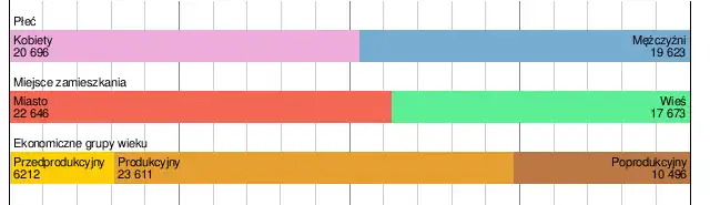 Wskaźnik urbanizacji wyniósł 56,2%; w miastach w tym dniu mieszkało 22 646 osób, zaś na wsi 17 673 osób[15].
