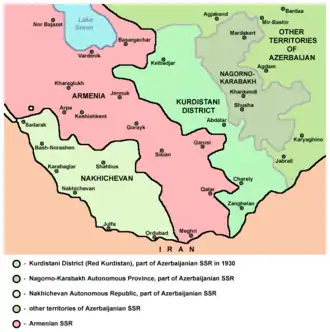 8 kwietnia 1929 powiat kurdystański został zniesiony w związku z wprowadzeniem podziału administracyjnego na okręgi. Tereny zniesionego powiatu kurdystańskiego objął okręg karabachski. Dopiero pod naciskiem władz centralnych 25 maja 1930 władze Azerbejdżańskiej SRR powołały oddzielną jednostkę administracyjną obejmującą ziemie zamieszkane przez Kurdów – okręg kurdystański. Oprócz ziem dawnego powiatu kurdystańskiego objął on również rejon zangilański i część rejonu dżebrailskiego, graniczące z Iranem. Jednakże już 23 lipca 1930 rząd ZSRR zniósł podział administracyjny na okręgi, w ślad za czym 8 sierpnia 1930 władze Azerbejdżanu zniosły podział republiki na okręgi. Okręg kurdystański przestał istnieć.