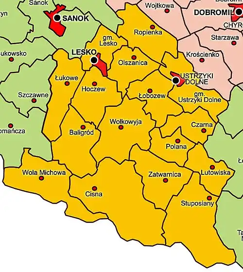 - ↑ Powiat leski w liczbach [online], Polska w liczbach [dostęp 2016-01-21], liczba ludności na podstawie danych GUS.