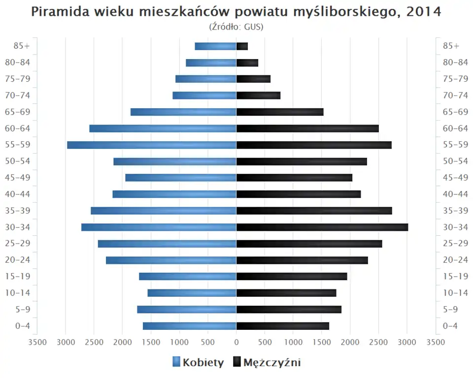 - Piramida wieku mieszkańców powiatu myśliborskiego w 2014 roku[13].