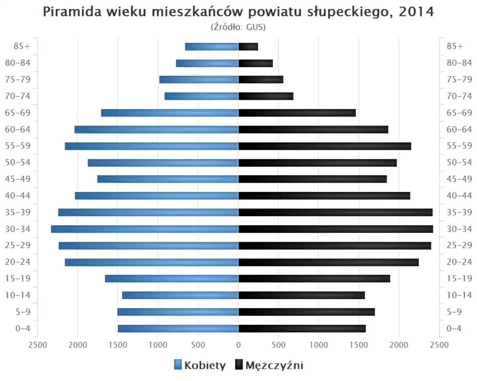 - Piramida wieku mieszkańców powiatu słupeckiego w 2014 roku[17]: