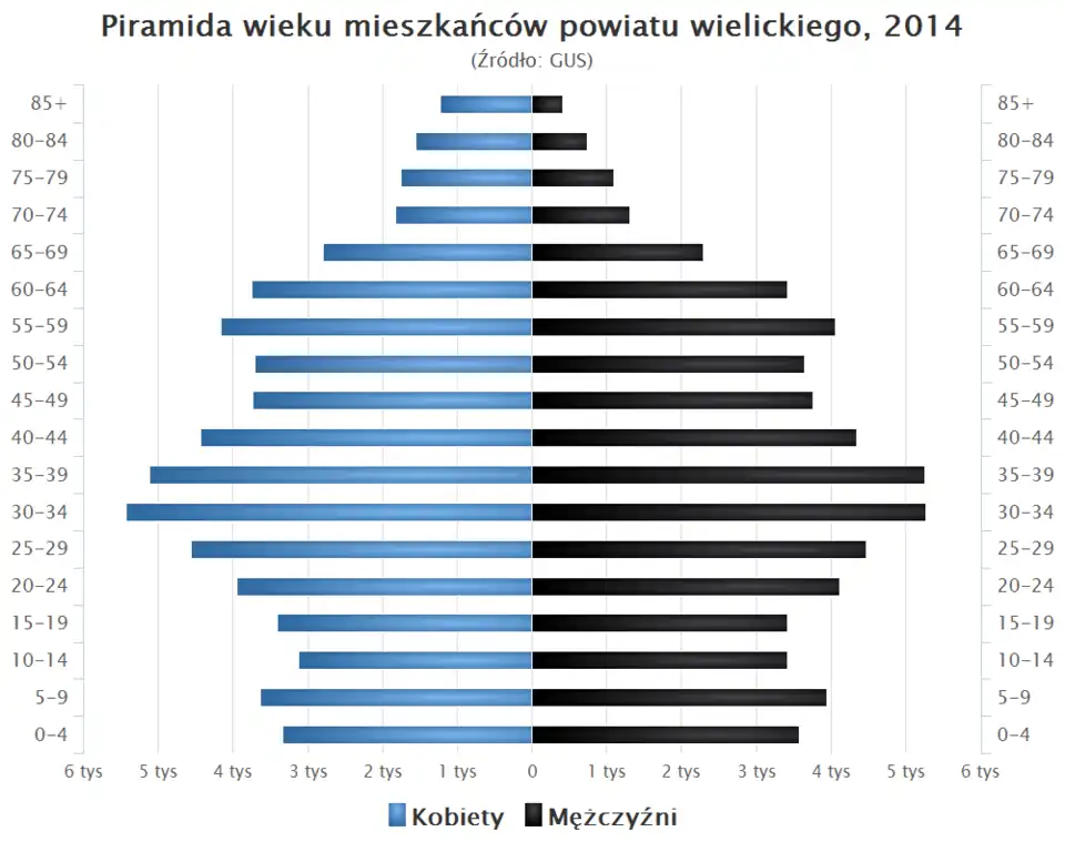 - Piramida wieku mieszkańców powiatu wielickiego w 2014 roku[6].