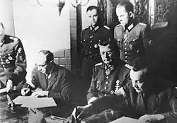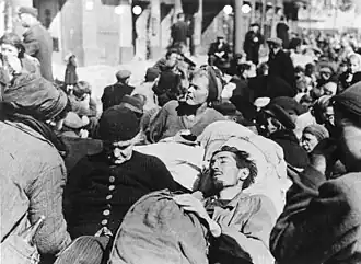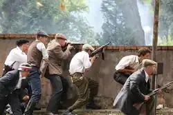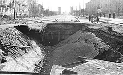 ![]() Zgodnie z ruchem wskazówek zegara, od lewego górnego rogu: mieszkańcy Warszawy budujący rów przeciwpancerny na Woli; niemiecka armata przeciwpancerna na placu Teatralnym; żołnierz Armii Krajowej broniący barykady; zniszczenia na ulicy Bielańskiej; powstańcy opuszczający miasto po poddaniu się siłom niemieckim; alianckie samoloty transportowe zrzucające zasoby w pobliżu bazyliki Świętego Krzyża | |||