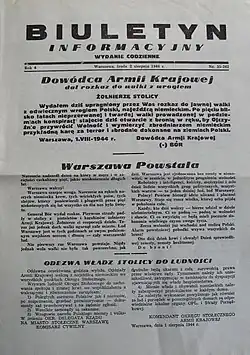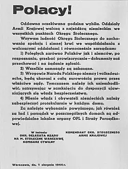 - 29 lipca (w godzinach wieczornych) Radio Moskwa nadało w języku polskim wezwanie do ludności Warszawy. Głosiło ono, że dla polskiej stolicy „godzina czynu wybiła” oraz zapowiadało, że „czynną walkę na ulicach Warszawy [...] nie tylko przyspieszymy chwilę ostatecznego wyzwolenia, lecz ocalimy również majątek narodowy i życie waszych braci”. Tego samego dnia na murach Warszawy pojawiła się odezwa podpisana przez samozwańczego generała Juliana Skokowskiego – przywódcę lewicowej Polskiej Armii Ludowej, którego wywiad AK uważał za agenta sowieckiego[55]. W odezwie informowano fałszywie, że generał „Bór” wraz z KG AK uciekli z Warszawy, a Skokowski obejmuje dowództwo nad wszystkimi organizacjami podziemnymi w mieście i zarządza mobilizację do walki z Niemcami. Z kolei 30 lipca należąca do komunistycznego ZPP „Radiostacja Kościuszko” kilkukrotnie powtórzyła wezwanie, w którym znalazły się słowa: „Ludu Warszawy! Do broni! Niech ludność całą stanie murem wokół Krajowej Rady Narodowej, wokół warszawskiej Armii Podziemnej. Uderzcie na Niemców, Udaremnijcie ich plany zburzenia budowli publicznych. Pomóżcie Armii Czerwonej w przeprawie przez Wisłę [...] Milion mieszkańców Warszawy niechaj się stanie milionem żołnierzy, którzy wypędzą niemieckich najeźdźców i zdobędą wolność”[56]. Sowieckie lotnictwo zrzuciło także nad miastem ulotki propagandowe o podobnej treści[57][58]. W obliczu tych faktów dowództwo AK obawiało się, że w momencie wkraczania Armii Czerwonej komuniści sprowokują wystąpienia zbrojne, w które masowo zaangażuje się ludność Warszawy, wyczekująca od lat możliwości odwetu na okupantach, a nawet szeregowi żołnierze AK. W ten sposób komuniści odebraliby legalnym władzom RP ostatni atut oraz potwierdziliby tezy sowieckiej propagandy, jakoby Polskie Państwo Podziemne nie prowadziło walki z Niemcami[56].
