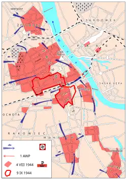 Powstanie warszawskie[a] (1 sierpnia – 3 października 1944[b]) – wystąpienie zbrojne przeciwko okupującym Warszawę wojskom niemieckim, zorganizowane przez Armię Krajową w ramach akcji „Burza”[1], połączone z ujawnieniem się i oficjalną działalnością najwyższych struktur Polskiego Państwa Podziemnego. Największa operacja militarna Armii Krajowej[2]. Swoim maksymalnym zasięgiem objęła część lewobrzeżnych dzielnic miasta, niewielki obszar prawobrzeżnej Warszawy, a także Puszczę Kampinoską, Legionowo i okolice Marek. Była to największa bitwa stoczona podczas II wojny światowej przez organizację podziemną z wojskami okupacyjnymi[3][4].