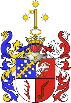 Klejnot: klucz złoty, zębem do góry, między trzema gwiazdami ośmiopromiennymi, złotymi (1 i 2)