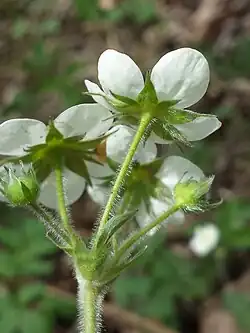 - Na łodygach wyrasta zwykle od 3 do 10 kwiatków białych, niekiedy nieco żółtawych, pięciopłatkowych. Kwiatostany są zwykle wyraźnie dłuższe od liści z szypułkami kwiatowymi z poziomo odstającymi włoskami. Kielich na owocu odstający lub odgięty. Płatki dłuższe od działek, zwykle niestykające się brzegami.