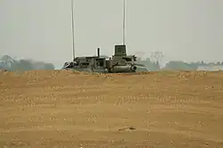 Pozycja z ukrytą wieżą jest natomiast pozycją, w której pojazd bojowy znajduje się kilka metrów dalej niż przy przyjęciu pozycji z ukrytym kadłubem. Pozycja ta pozwala załodze dokonywać obserwacji pola z włazu, podczas gdy reszta pojazdu znajduje się poza zasięgiem wzroku nieprzyjaciela.