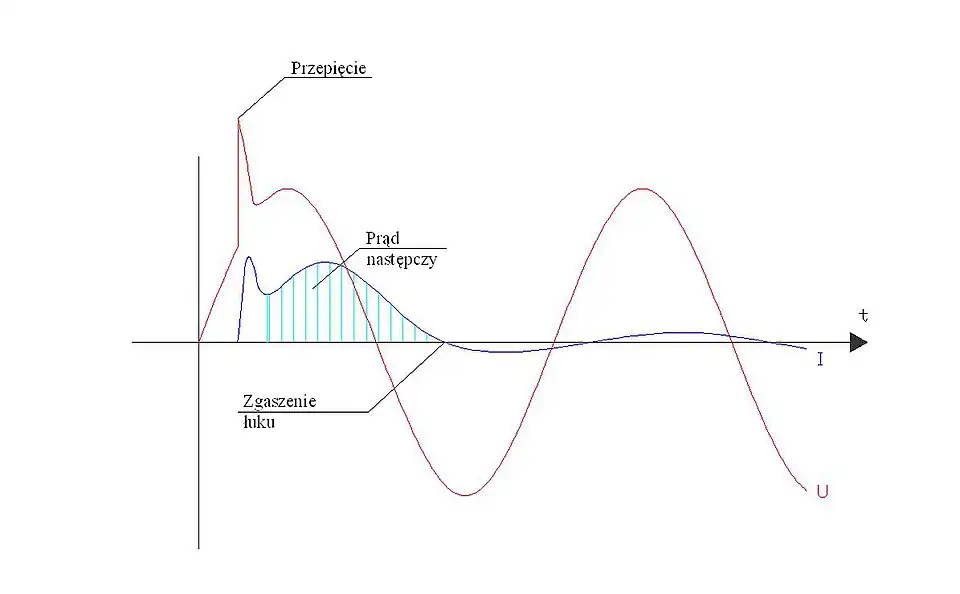 Prąd ten wynika z fizyki zjawiska łuku elektrycznego. Palący się łuk elektryczny w iskierniku zanika tylko przy zerowej wartości płynącego prądu. Gdy zanika prąd awaryjny, obwód pozostaje zwarty poprzez łuk elektryczny, który jest podtrzymywany tym razem prądem zwarciowym sieci. Dopiero gdy prąd zwarciowy spada do zera następuje zgaszenie łuku.