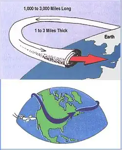 Prądy strumieniowe są zazwyczaj ciągłe w dużym obszarze długości geograficznych ale istnieją też przypadki prądów nieciągłych[1]. Rozkład prądów strumieniowych ma zazwyczaj wiele meandrów (zafalowań), które propagują się na wschód, z mniejszymi prędkościami niż sama prędkość wiatru w przepływie. Każde zafalowanie wewnątrz prądu strumieniowego jest falą Rossby’ego (fala planetarna). Fale Rossby’ego są związane ze zmianami siły Coriolisa z szerokością geograficzną. Krótkie fale wewnątrz fali Rossby’ego mają długość od 1000 do 4000 kilometrów[2]. Fale te poruszają wzdłuż grzbietów i bruzd (dolin) fal Rossby’ego.