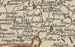 - ↑ Johann Wolfgang Wieland, Principatus Silesiae Oppoliensis exactissima Tabula geographica, sistens Circulus Oppoliensem Ober-Glogau Gros Strehliz, Cosel, Tost, Rosenberg, Falckenberg & Lubleniz, Norimbergae: ab Homannianis Heredibus. Cum Spec. S. Caes. Rque Mtis Privilegio, 1736.