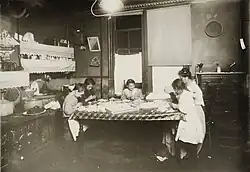 U progu XX wieku dzieci pracowały nie tylko w takich miejscach jak fabryki i kopalnie, lecz również w domach[8]. Rządy i reformatorzy stopniowo regulowali pracę w fabrykach, co powodowało przenoszenie pracy z fabryk do domów w środowiskach miejskich. Rodziny (a w nich zwłaszcza kobiety) często popierały takie rozwiązania, ponieważ produkcja domowa pozwalała na uzyskanie dodatkowych dochodów przy jednoczesnej realizacji obowiązków domowych.