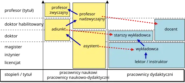 Uwagi: [1] Profesor zwyczajny i profesor nadzwyczajny (obecnie profesor uczelni) to dawne stanowiska. Nie należało ich mylić z tytułem naukowym profesora.