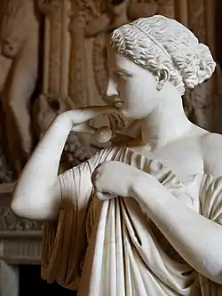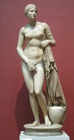 - Afrodyta Knidyjska- rzeźba bogini wykonana z paryjskiego marmuru. Postać kobiety na posągu lekko pochyla się do przodu i na bok, zakrywając część ciała prawą dłonią, w geście skromności wielokrotnie powtarzanym później w licznych aktach. Wyraz jej twarzy stanowi syntezę delikatności, godności i frywolności, ze szczegółami bardzo lekko zaznaczonymi i subtelnym potraktowaniem skóry, tworzącym piękny kontrast świateł i cieni.