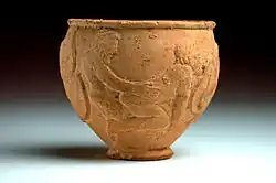 Starożytny grecki gliniany kubek z dekoracją reliefową przedstawiającą dwóch mężczyzn uprawiających seks analny