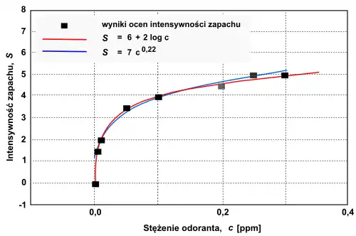 Przebieg obu funkcji S = f (c) jest bardzo podobny, zwłaszcza w tym zakresie, w którym wrażenia są już wyraźne, ale jeszcze niezbyt mocne. Przez chmurę punktów doświadczalnych na wykresach (naturalny rozrzut wyników ocen intensywności zapachu jest duży) można przeprowadzić zarówno krzywą logarytmiczną, jak potęgową. W obu przypadkach uzyskuje się podobne współczynniki korelacji, co uniemożliwia stwierdzenie, które z praw jest lepiej spełniane. Nie wyklucza się, że zależność intensywności zapachu różnych związków, a zwłaszcza mieszanin odorantów, od ich stężenia w powietrzu powinna być opisywana z użyciem bardziej złożonych funkcji nieliniowych, które są poszukiwane[6][7][8].