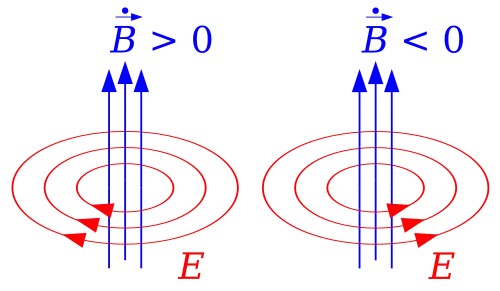 - Jeżeli natężenie pola magnetycznego pośrodku zwojnicy wzrasta, indukuje to w niej pole i prąd elektryczny o takim kierunku, że wytwarzane przezeń wtórne pole magnetyczne przeciwdziałać będzie dalszemu wzrostowi pierwotnego pola (zob. rysunek z prawej), i vice versa: jeżeli natężenie pola magnetycznego pośrodku zwojnicy słabnie, indukuje to w niej pole i prąd elektryczny o takim kierunku, że wytwarzane przezeń wtórne pole magnetyczne podtrzymać będzie słabnące pole pierwotne (zob. rysunek z prawej).