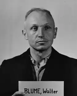 | Walter Blume | SS-Standartenführer; członek SD i Gestapo; dowódca Sonderkommando 7a w Einsatzgruppe B | Skazany na śmierć przez powieszenie | Wyrok złagodzono do 25 lat więzienia; zwolniony w roku 1955, zmarł w roku 1974 | |