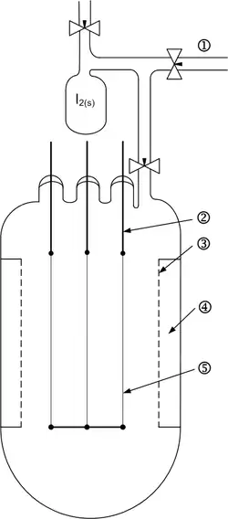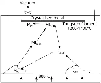 Zanieczyszczony metal ogrzewa się w naczyniu próżniowym z jodem (lub innym fluorowcem) w temperaturze ok. 500 °C[3]. Powstające jodki, np. TiI4 lub ZrI4, ulatniają się pozostawiając zanieczyszczenia w stanie stałym[3]. Przy ciśnieniu atmosferycznym TiI4 topi się w 155 °C, a wrze w 377 °C, podczas gdy ZrI4 topi się w 499 °C (punkt potrójny), a w 431 °C sublimuje[4]. Temperatury wrzenia są niższe przy mniejszych ciśnieniach. Gazowy tetrajodek metalu jest rozkładany na rozgrzanym do białości (1200 °C) włóknie wolframowym[3]. W miarę jak coraz więcej metalu odkłada się, włókno zaczyna lepiej przewodzić prąd, przez co wymagane jest coraz więcej prądu do utrzymania wysokiej temperatury włókna. Proces oczyszczania opisują dwa równania: