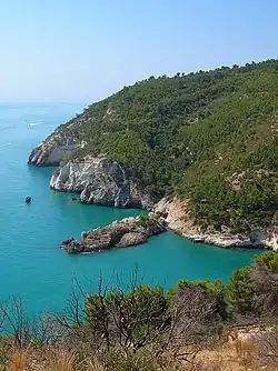 Północna linia brzegowa półwyspu Gargano aż po kurort Vieste to plaże piaszczyste, z nielicznymi skalistymi klifami. Po południowej stronie półwyspu znajdują się wysokie klify oraz plaże żwirowe. Jedną z najsłynniejszych plaż jest Vignanotica z charakterystycznym białym klifem, górującym nad zatoką[3].