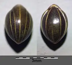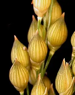 - Białawe ziarniaki zamknięte w twardych, skórzastych, bezostnych plewkach o długości do 3 mm, które po dojrzeniu ziarniaków łatwo wypadają razem z nimi z plew. Plewki mają różnorodne zabarwienie – białe, żółte, siwe, czerwone, a nawet czarne. Plewki dolne kwiatu płodnego są podobne do plew – skórzasto-błoniaste i o podobnej długości. Mają 5 nerwów, są mocno wysklepione z 6-8 długimi, żółtymi liniami. Plewki górne tego kwiatu są błoniaste i spiczasto zakończone. Mają 2 nerwy i 3-4 żółte linie. Zarodek jest równy co najmniej 1/3 długości ziarniaka[9].