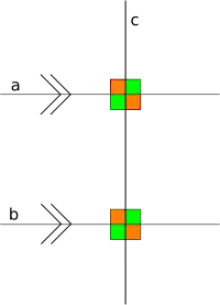 Zilustrowano to na rys. obok. Jeżeli dwie proste ( oraz ) są obie prostopadłe do trzeciej prostej to wszystkie stworzone na trzeciej prostej kąty są proste. Wszystkie zacieniowane na pomarańczowo kąty są przystające; podobnie kąty zacieniowane na zielono, ponieważ kąty wierzchołkowe są przystające, a naprzemianległe kąty wewnętrzne wyznaczone przez prostą transwersalną przecinającą proste równoległe są przystające. Stąd jeżeli proste oraz są równoległe, to jedno z następujących stwierdzeń pociąga pozostałe:
