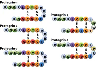 Protegryny – peptydy antydrobnoustrojowe pochodzące z leukocytów wieprzowych, należące do rodziny katelicydyn. Są to kationowe, bogate w cysteinę białka zbudowane z 16-18 aminokwasów, zawierające dwa wiązania dwusiarczkowe, w roztworze przyjmujące strukturę β. Białkiem o najsilniejszych właściwościach przeciwbakteryjnych jest protegryna-1 (PG-1) hamująca rozwój zakażenia dwoinką Neisseria gonorrhoeae, Chlamydia trachomatis serowarem L2 oraz serowarami E i MoPn. Szczegółowe badania budowy i funkcji PG-1 wykazały, że amfipatyczna centralna β-płaszczyzna PG-1 jest niezbędna dla ich działania bakteriobójczego.