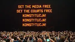 Przeciwko ograniczaniu wolności mediów, niezawisłości sądów i łamaniu konstytucji wystąpił też Roger Waters w czasie koncertu w Gdańsku w ramach trasy Us+Them 5 sierpnia 2018 r.[20]