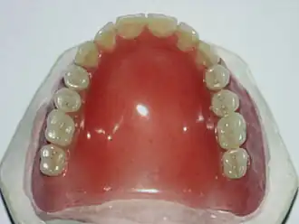 - protezy stomatologiczne ruchome (pacjent może wyciągnąć je z jamy ustnej bez ingerencji lekarza) najczęściej wykonane z akrylu, składają się z płyty obejmującej wyrostki zębodołowe i podniebienie twarde (w protezach częściowych zasięg pola płyty protezy może zostać przez technika znacznie ograniczony) - gdy płyta wykonana jest ze stopu metalu jest to tzw. proteza szkieletowa - oraz osadzonych na płycie zębów (produkowanych fabrycznie); w protezach częściowych osadza się także klamry (doginane z drutu lub lane), utrzymujące tę protezę; dzielimy na: