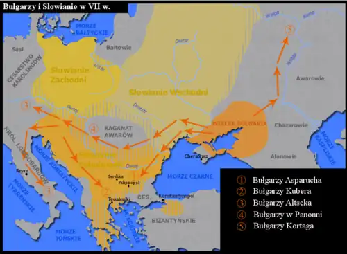 Najznakomitszy spośród synów Kubrata miał być udział Asparucha. Z delty Dunaju podjął on w 680 roku próbę zajęcia terenów położonych po południowej stronie rzeki. Cesarz Konstantyn IV zorganizował w związku z tym wyprawę wojenną przeciwko niemu, ale armia bizantyjska poniosła klęskę i Bizancjum zmuszone zostało uznać oderwanie części swego terytorium pomiędzy Dunajem a Starą Płaniną i powstanie państwa bułgarskiego. Państwo zorganizowane przez Asparucha poprzez podporządkowanie Protobułgarom znacznie liczniejszej ludności słowiańskiej, zamieszkującej to terytorium, miało święcić w przyszłości wspaniałe triumfy. Natomiast Protobułgarzy, stosunkowo szybko, bo w przeciągu dwóch stuleci całkowicie się zeslawizowali i porzucili turecki język swych przodków. Wraz z Asparuchem przekroczyło Dunaj około 50 tysięcy Protobułgarów, którzy po wysiedleniu ze wschodniej części Bułgarii naddunajskiej plemion Siewierców i Siedmiu Rodów osiedlili się w Dobrudży i wschodniej połaci Mezji Dolnej, w północno-wschodniej części obecnej Bułgarii. Mimo dopływu elementu protobułgarskiego, szczególnie Protobułgarów panońskich w IX wieku, dosyć szybko doszło do zmieszania Protobułgarów ze Słowianami i przejmowania przez Protobułgarów wzorców liczniejszej i wcześniej osiadłej na Bałkanach ludności słowiańskiej. Sporo protobułgarskich rodów wyginęło w czasie walk wewnętrznych w VIII i IX wieku pomiędzy stronnictwami anty- i prosłowiańskimi oraz po wprowadzeniu chrześcijaństwa w walkach bojarskiej opozycji pogańskiej z kniaziem Borysem Michałem. Ostatecznie po dwóch stuleciach od powstania państwa bułgarskiego Protobułgarzy zeslawizowali się. Pozostała po nich nazwa Bułgarii, szereg terminów dotyczących życia państwowego, silne elementy azjatyckie, głównie irańskie i tureckie, w sztuce bułgarskiej, organizacja państwa i koncepcja polityczna, która przetrwać miała upadek I państwa bułgarskiego w 1018 roku[16].