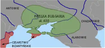 - ↑ Skłania to część badaczy do objęcia terminem Wielka Bułgaria państw bułgarskich istniejących nad Morzem Czarnym w VI i VII wieku (D. Lang, Bułgarzy, s. 37; W. Gjuzelew, Bułgaria, s.27-28). Część historyków rozumie przez Wielką Bułgarię wyłącznie państwo istniejące nad Morzem Czarnym pomiędzy 630 a 660/668 rokiem (T. Wasilewski, Historia Bułgarii, s. 33; S. Waklinow, Kultura Starobułgarska, s. 48-49)