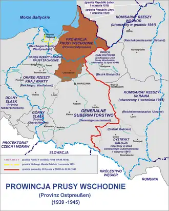 W latach 1939–1945 częściami Prus Wschodnich były również rejencja ciechanowska (Regierungsbezirk Zichenau) oraz „trójkąt suwalski”, a w latach 1941–1945 również rejencję zachodniopruską włączono zaś do Okręgu Rzeszy Gdańsk-Prusy Zachodnie.
