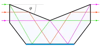Budowę i zasadę działania wyjaśnia rysunek 1. Promienie padają z lewej strony prostopadle na powierzchnię pryzmatu. Następnie ulegają całkowitemu odbiciu wewnętrznemu od górnej powierzchni pryzmatu. Dalej odbijają się od lustrzanej dolnej powierzchni. Teraz znów ma miejsce całkowite odbicie wewnętrzne od górnej powierzchni i promienie opuszczają pryzmat prostopadle do prawej ścianki. Z analizy rysunku wynika, że warunkiem działania pryzmatu jest, aby