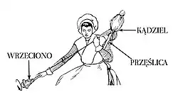 - ↑ A Time-Tested Fiber Management Tool: The Modern Handheld Distaff [online], Spin Off [dostęp 2021-06-03] (ang.).