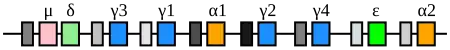 Szare prostokąty oznaczają sekwencje S. Są one wyróżnione stopniami szarości, gdyż nie są identyczne, co jest niezbędne do selektywnego wyboru konkretnej klasy przeciwciał.