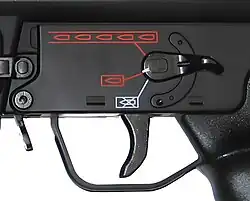 W niektórych modelach broni przełącznik umożliwia również włączenie ogranicznika długości serii i bezpiecznika.