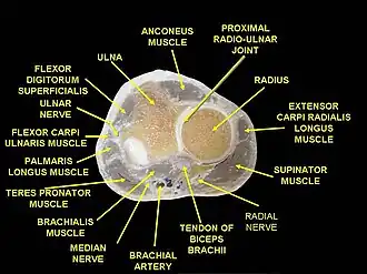 W górnej części przedramienia znajduje się dół łokciowy, przez który przechodzą struktury z ramienia na przedramię, z wyjątkiem nerwu łokciowego (biegnie on ku tyłowi od nadkłykcia przyśrodkowego kości ramiennej). W dolnej części przedramienia znajduje się kanał nadgarstka, przez który struktury z przedramienia przechodzą na rękę – główny wyjątek stanowi tętnica promieniowa, która przechodzi na tylnej powierzchni nadgarstka.