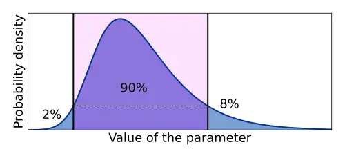 - Wybór przedziału, w przypadku którego prawdopodobieństwo znalezienia się poniżej dolnego krańca przedziału jest tak samo, jak prawdopodobieństwo znalezienia się powyżej górnego krańca. Przedział ten będzie obejmował medianę. Taki przedział nazywa się czasem przedziałem o równych ogonach (ang. equal-tailed interval).