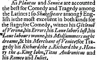 Należy także odnotować, iż w zestawieniu tym Troilus i Kresyda została uznana za tragedię, zgodnie z klasyfikacją z Pierwszego Folio, jednocześnie nie jest to jednoznaczne: współcześni badacze uznają ją za komedię[11].