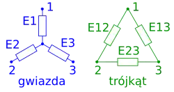 Czasami zachodzi potrzeba zastąpienia układu połączonego w trójkąt równoważnym układem połączonym w gwiazdę. Równoważność oznacza tutaj warunek niezmienności prądów i napięć w tej części obwodu, która nie podlega przekształceniu transfiguracji.