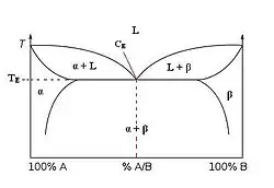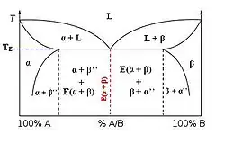 Dla układu wykazującego ograniczoną rozpuszczalność w stanie stałym z cieczy w temperaturze zajścia przemiany eutektycznej wydziela się mieszanina kryształów faz α i β[1][2].