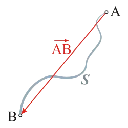 Jeżeli punkt materialny porusza się od położenia A do położenia B, jego przemieszczenie przedstawia wektor Tor ruchu punktu materialnego w ruchu krzywoliniowym nie pokrywa się z wektorem przemieszczenia a droga będąca długością tego fragmentu toru, jest większa lub równa wartości przemieszczenia[1].