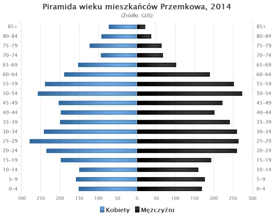 Piramida wieku mieszkańców Przemkowa w 2014 roku[23].